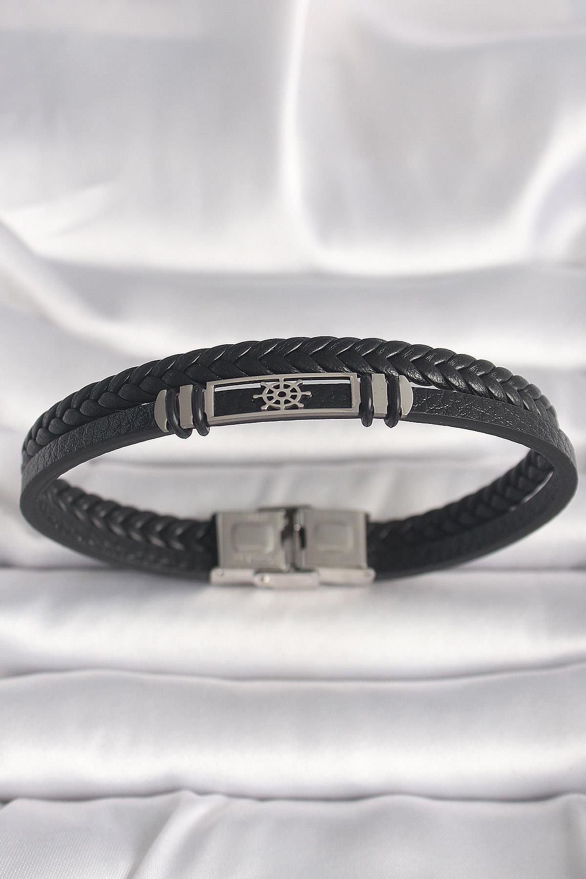 316L Çelik Gümüş Renk Gemi Dümeni Figür Siyah Burgu Deri Kordon Model Erkek Bileklik (EB3701)