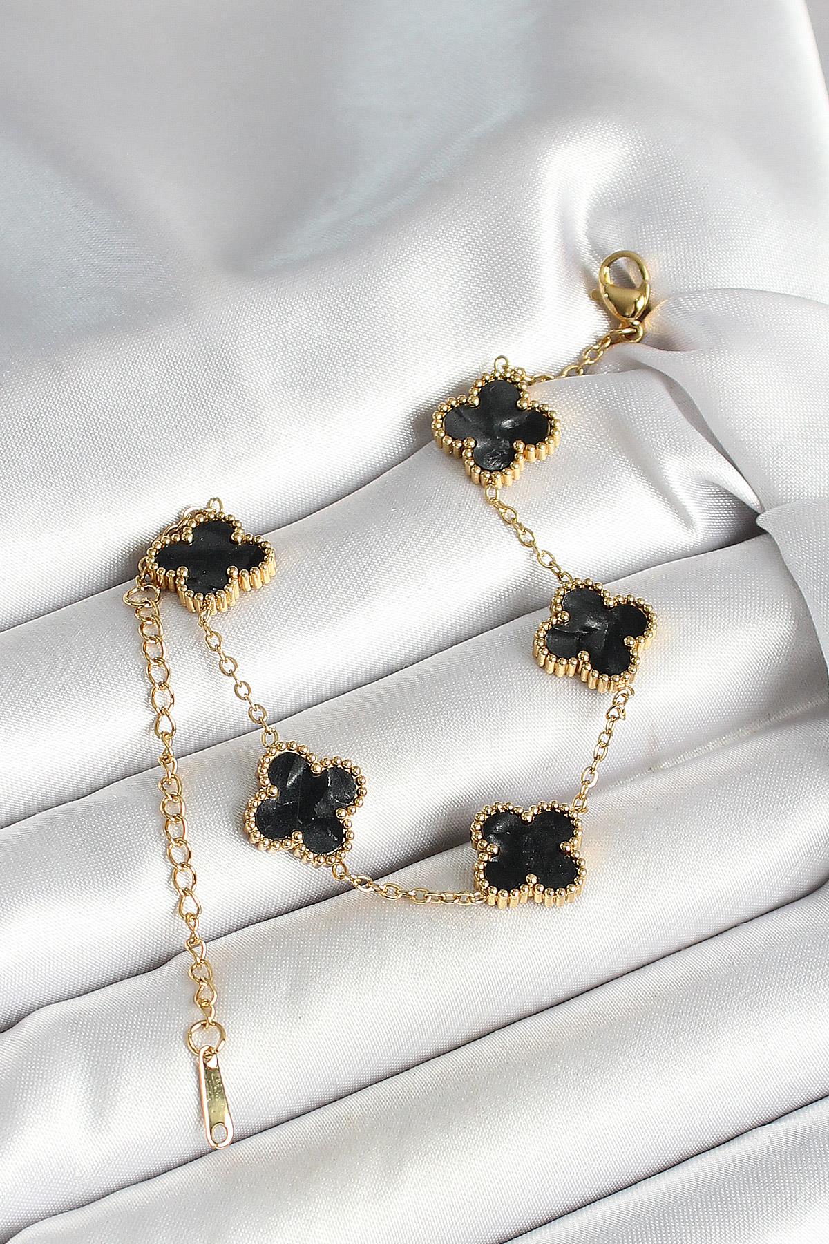 316L Çelik Sedefli Siyah Gold Renk Yonca Kadın Bileklik (BB6969)
