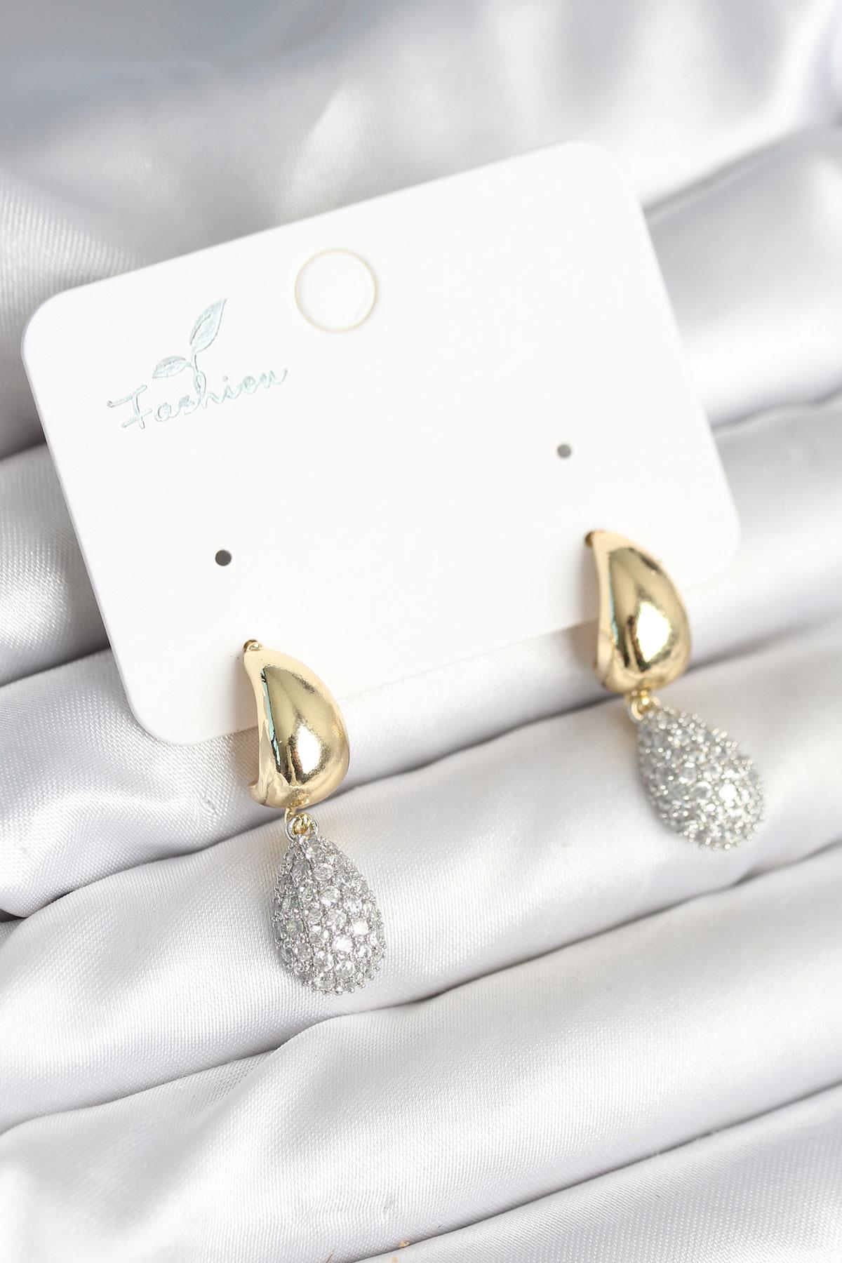 Gold Renk Zirkon Taşlı Damla Pirinç Kadın Küpe (BKP11288)