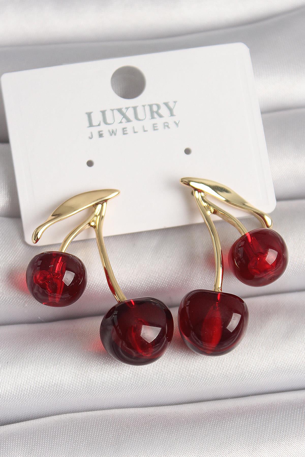 Pirinç Gold Renk Kırmızı Kiraz Model Kadın Küpe (BKP10460)