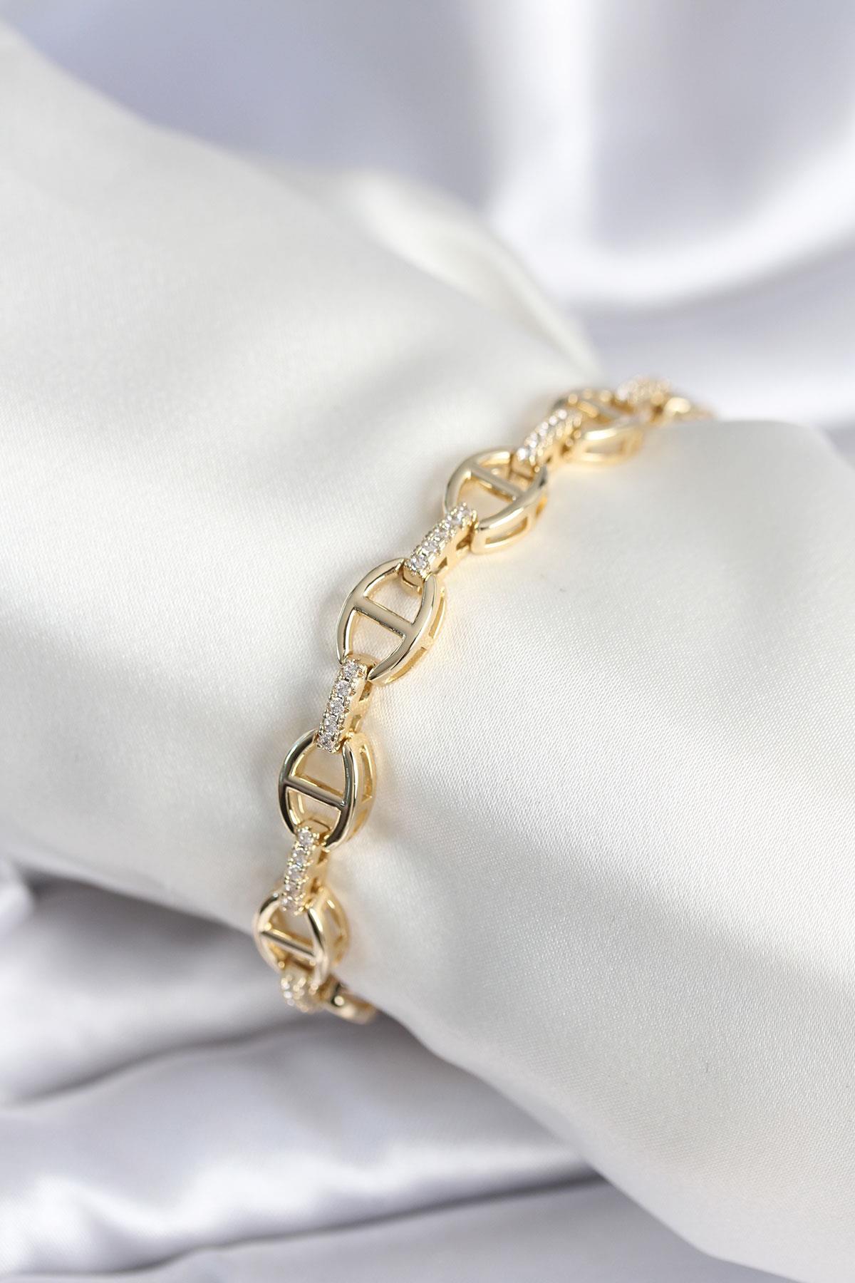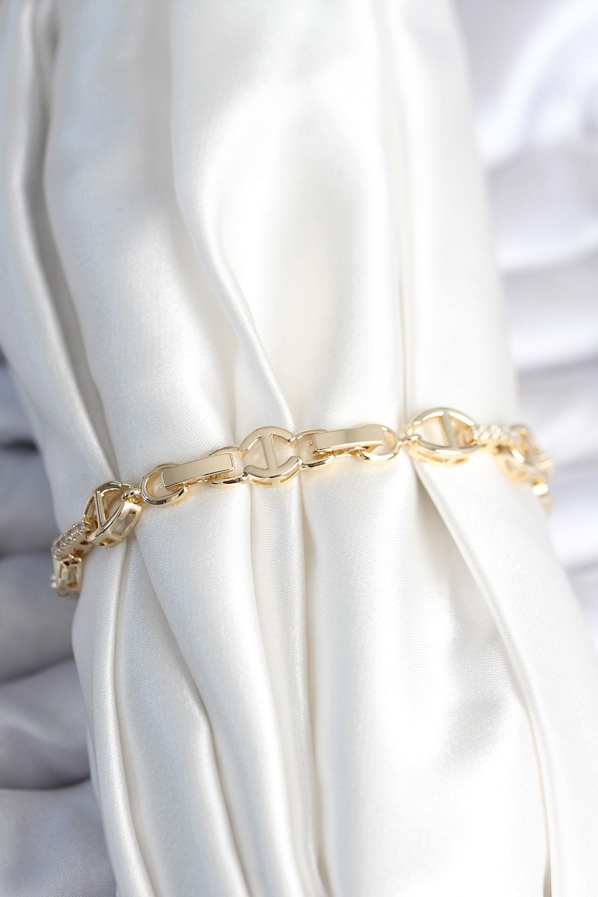 Pirinç Gold Renk Parçalı Zincir Model Kadın Bileklik (BB7966)
