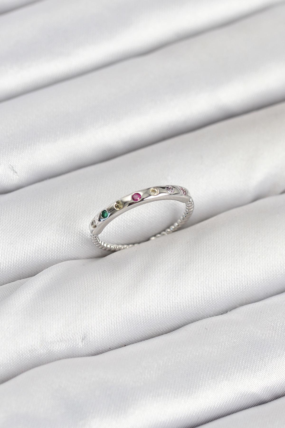 Pirinç Gümüş Renk Renkli Zirkon Taşlı Kadın Yüzük (BYK3885)