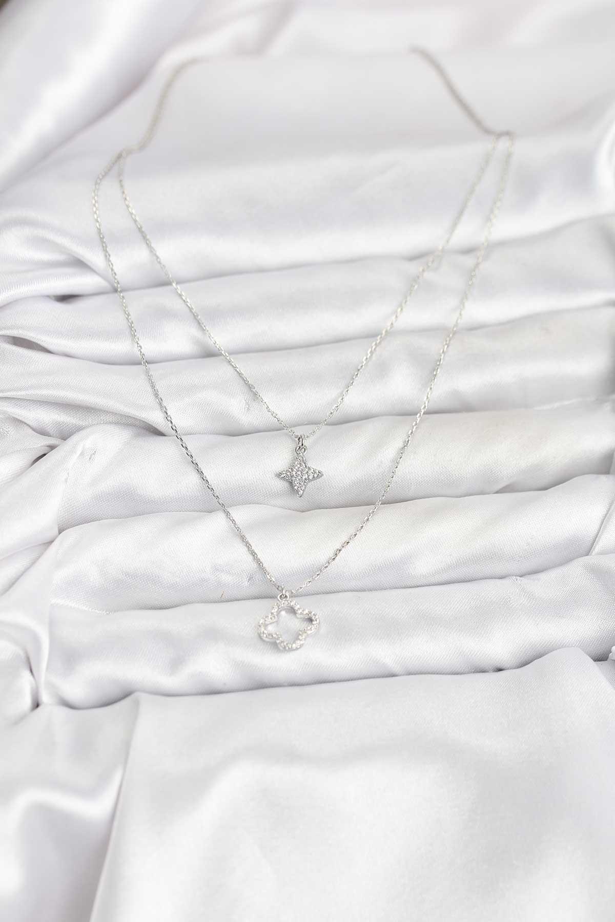 Pirinç Gümüş Renk Yonca Model 2li Kadın Kolye (BKO10802)