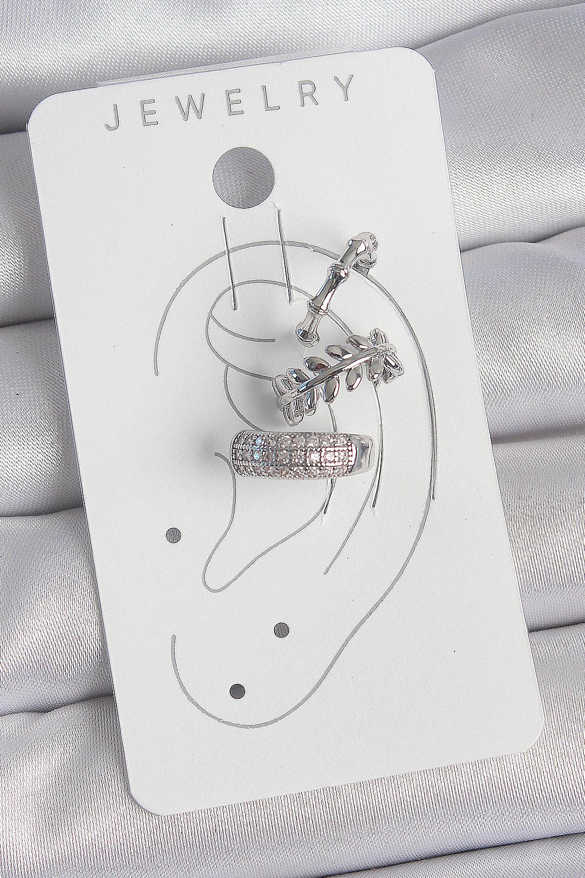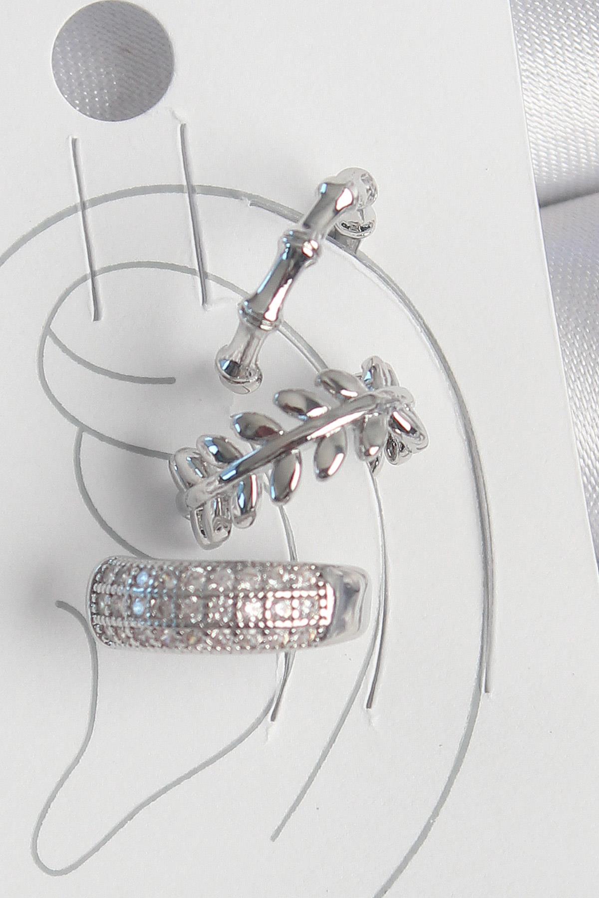 Pirinç Gümüş Renk Zirkon Taşlı 3Lü Model Yaprak Figür Kadın Kıkırdak Küpe (BKP10564)