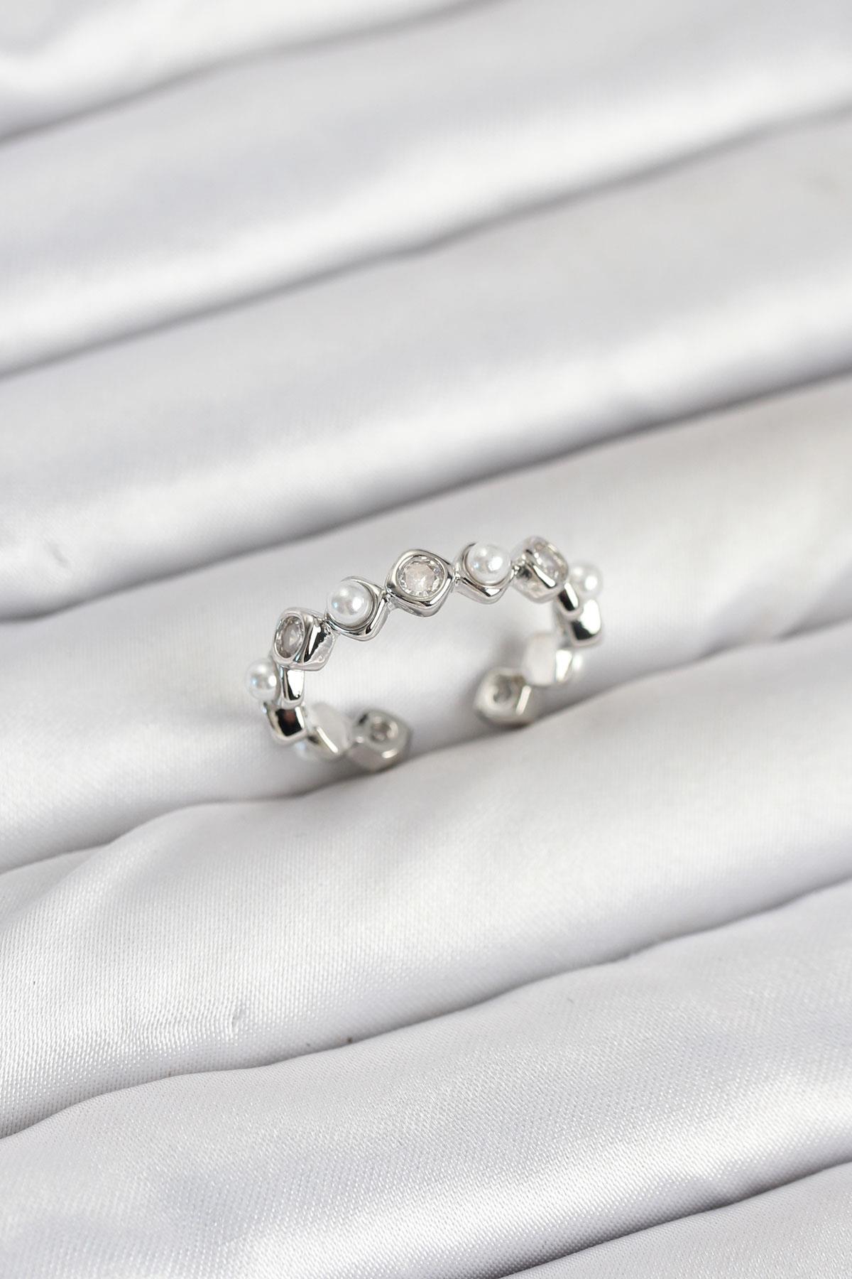 Pirinç Gümüş Renk Zirkon Taşlı İncili Kadın Yüzük (BYK3877)