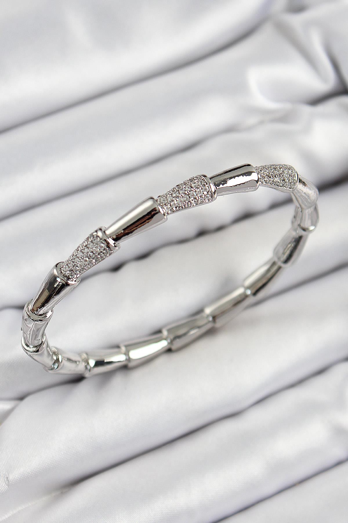 Pirinç Zirkon Taşlı Kemik Model Gümüş Renk Vip Kadın Bileklik (BB7340)
